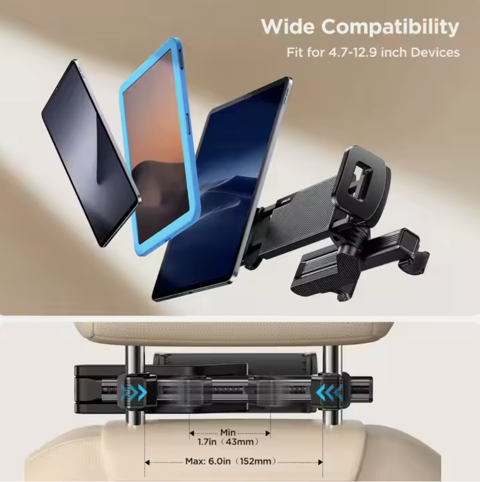 ✅【Structure Solide et Stable】 Doté de ressorts intégrés et de tiges métalliques robustes, ce support peut soutenir jusqu'à 40 livres, offrant une stabilité même sur des routes irrégulières. Cette nouvelle version s'ajuste aux barres d'appuie-tête de 1,7 à 6,0 pouces (43 à 152 mm), convenant aux véhicules tels que les SUV, camionnettes et berlines. ❗ Non compatible avec les véhicules sans barres métalliques d'appuie-tête, comme certains modèles Volvo.