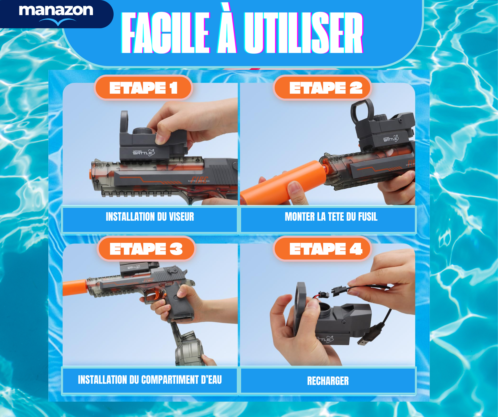 Le pistolet aspire l’eau automatiquement : tu remplis, tu tires, ça repart ! -